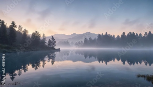 © methinee, Fototapeta premium Sparkling blue mist over a serene lake at dawn, sparkles, morning