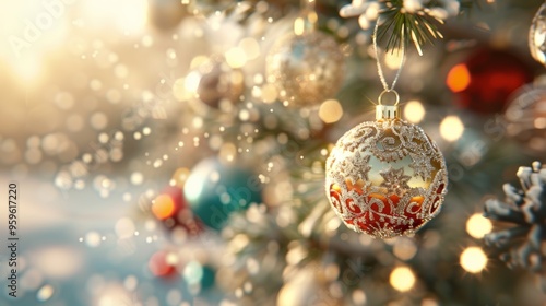 © Ruby Siam, Fototapeta premium Sparkling Christmas ornament hanging on a snow-covered tree, radiating festive vibes with warm sunlight filtering through.