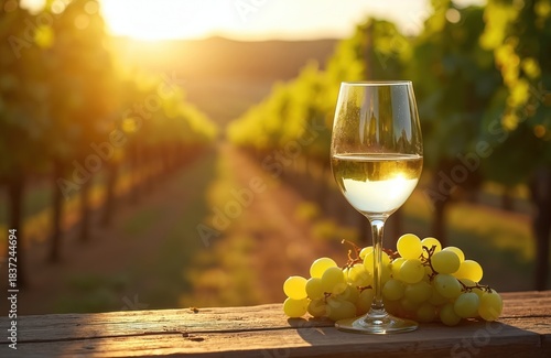 © Vadym, Obraz premium Sparkling clear glass of white wine, fresh green grapes rest on rustic wooden table. Long rows of grapevines stretch across beautiful sunny vineyard in background. Golden light of sunset illuminates