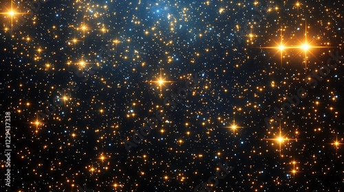© Tcukimay, Naklejka premium Sparkling cosmic background with numerous stars and galaxies in dark blue and golden hues.