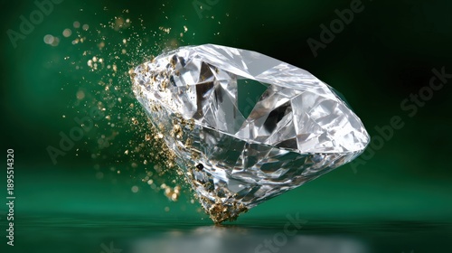 Fototapeta premium Sparkling diamond on emerald background with gold dust explosion