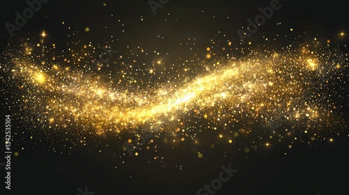 © Pixelzone, Naklejka premium Sparkling dust particles. PNG, Gold sparkle splatter border .Festive background with gold glitter and confetti for celebration. Background with glowing golden particles.