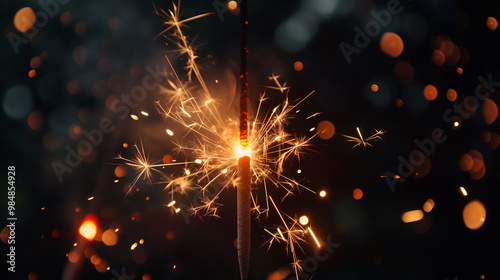 Fototapeta premium Sparkling fire on a black background with golden bokeh