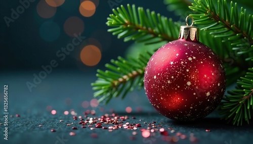Obraz premium Sparkling glass ball glitters on evergreen fir branch, holiday, festive, sparkly
