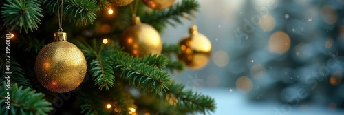 Fototapeta premium Sparkling golden ornaments adorn Christmas tree branches amidst lush greenery, ornaments, winter wonderland, sparkly balls