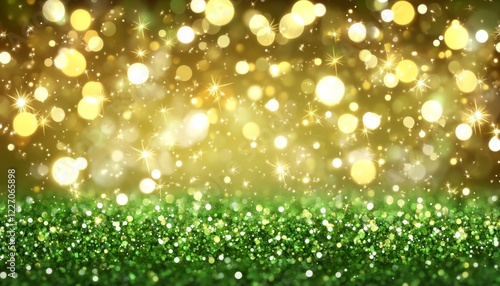 © Ilja, Fototapeta premium Sparkling Green Glitter Background with Festive Gold Bokeh Lights, Holiday or Celebration Backdrop.