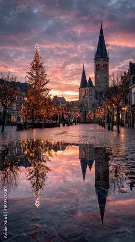 © Georg, Obraz premium Sparkling holiday lights illuminate cobblestone street at sunset near historic church in European town