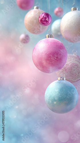 Fototapeta premium Sparkling holiday ornaments in soft pastel hues evoke festive cheer and elegant celebration for winter events and joyous occasions.