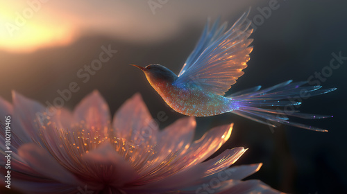 Fototapeta premium Sparkling Hummingbird in flight near a flower bathed in soft light enchanting...