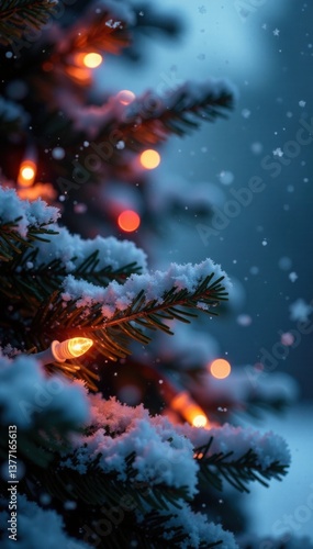 © Kachaphot, Fototapeta premium Sparkling icicles and snowflakes dance around colorful Christmas light bundle on evergreen branch, , outdoor ambiance, winter wonderland