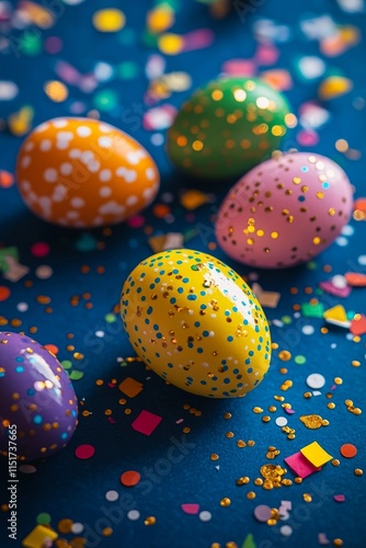 Obraz premium Sparkling Pastel Easter Eggs on Blue Background with Confetti, Celebrating Easter Festivities