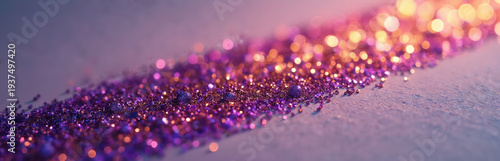 Fototapeta premium Sparkling purple and gold glitter particles spread across a surface. Tiny...