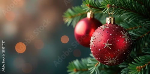 © Hugnaka, Fototapeta premium Sparkling red and silver Christmas balls on fir branch, red, sparkle, ornament