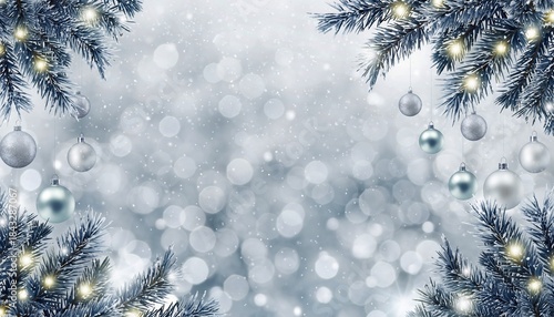 Naklejka premium Sparkling silver and blue Christmas ornaments hang on frosted pine branches against a bokeh backdrop, concept for holiday greetings, winter, and festive celebrations