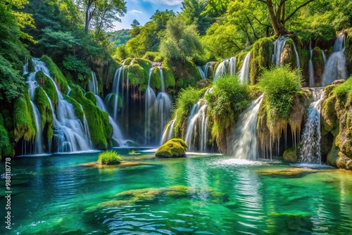Fototapeta premium Sparkling turquoise water cascades down moss-covered rocky cliffs, surrounded...