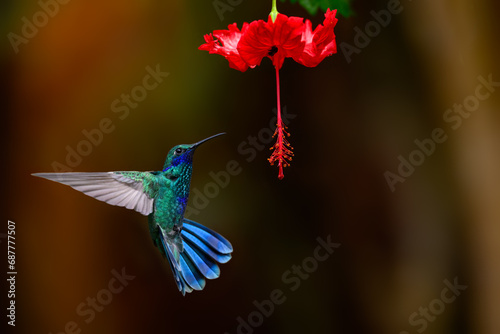 © FotoRequest, Fototapeta premium Sparkling Violetear Hummingbird in flight collecting nectar from beautiful red flower on dark background