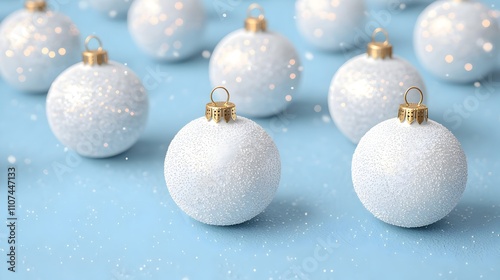 Fototapeta premium Sparkling White Christmas Ornaments on Blue Background
