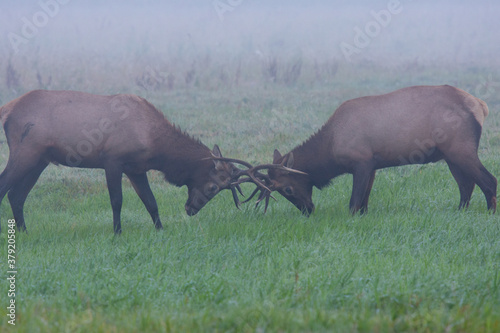 Fototapeta premium sparring bull elk with antlers