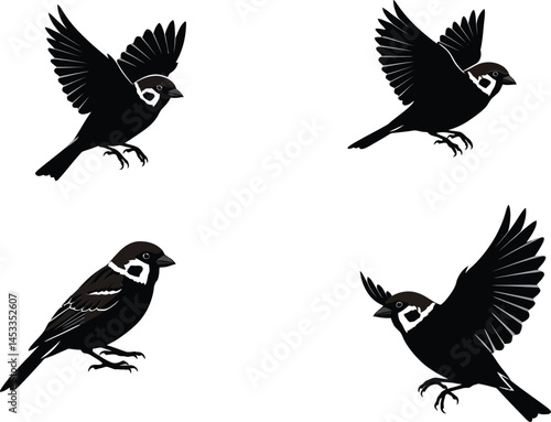 © Royal Ability, Obraz premium Sparrow bird detailed black and white sketch illustration set with flying and perched poses vector image