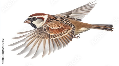© Alona, Naklejka premium Sparrow Isolated. Flying Eurasian Tree Sparrow on Adorable White Background