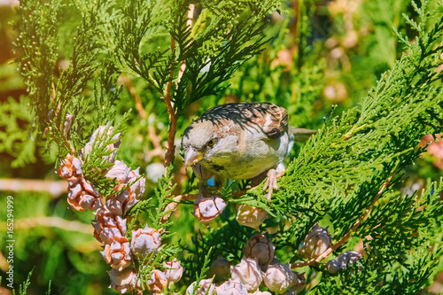 Obraz premium Sparrow on a Thuja