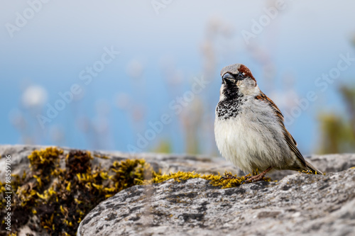 Naklejka premium Sparrow on the ground. House sparrow perching on rock in spring.