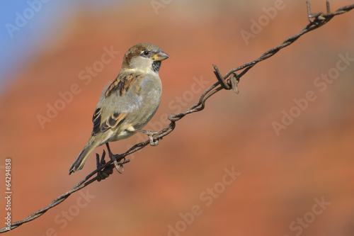 © a-weblogiq, Fototapeta premium Sparrow sitting on a metal fence