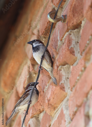 Fototapeta premium Sparrows sitting on a wire attached to a red wall. One looks into the wall, the other turned his back on her...