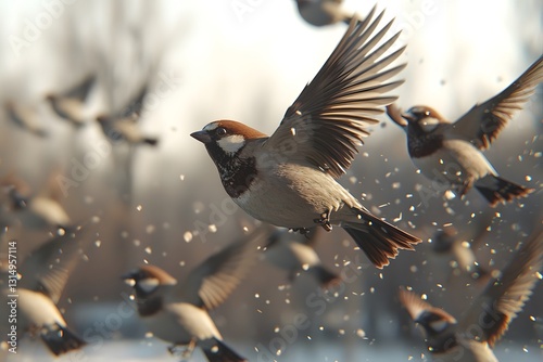 © Ethery, Obraz premium Sparrows under the Sun and Spring Park