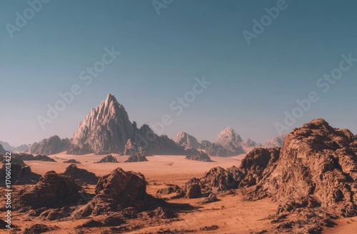 © Abun, Fototapeta premium Sparse arid landscape with rocky outcrops and distant, jagged mountains under a clear blue sky, evoking a desolate, otherworldy feel