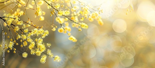© HN Works, Obraz premium Sparse Mimosa branch with yellow spring flowers; empty copy space image.