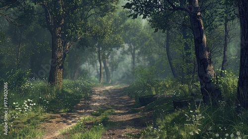© CreativeBro, Fototapeta premium Sparse path through vast forest with panoramic tree filled scenery