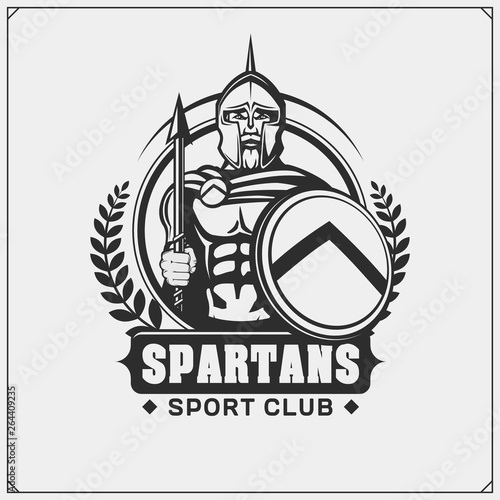 Naklejka premium Spartans emblem and label. Sport club design template. Ancient warrior, spartan spirit, gladiator.