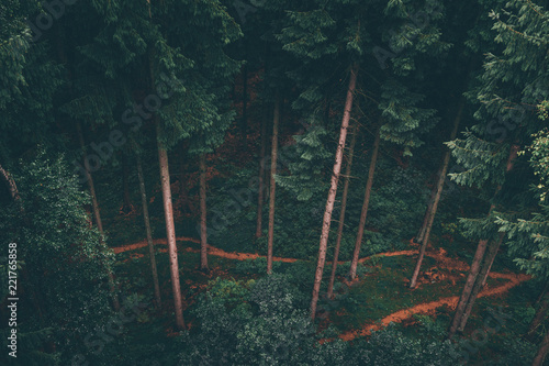 © kenopictures, Fototapeta premium Spazieren im Wald, Waldweg im Tannenwald dunkelgrün, Nationalpark Harz,