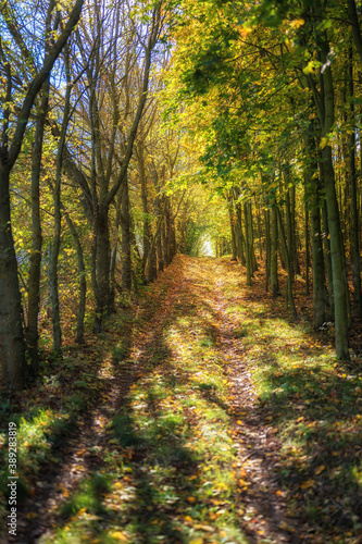 © Ralf Geithe, Fototapeta premium Spaziergang durch herbstlichen Wald mit bunten Blättern im Sonnenlicht