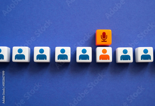© Andrii Yalanskyi, Obraz premium Speaker at the conference. Give a speech. Communication and announcements. Activity in social networks. A man with a microphone above his head symbolizing his turn to give a speech.