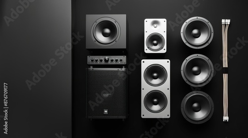 © Andrew505, Obraz premium Speakers and Audio Equipment on Black Background. Copy space, flat lay. For use in advertising, electronics promotions, and audio-related projects