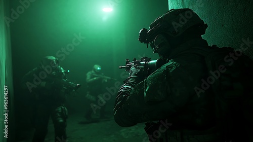© abangaboy, Fototapeta premium Special Forces Soldier Holding Assault Rifle in Green Smoke