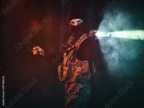 Fototapeta premium Special forces soldier with a pistol and a flashlight