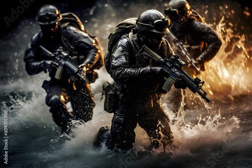 © Paul, Fototapeta premium Special forces soldiers in combat with rifles, and bullet-proof gear, face masks and heavy military equipment. Generated AI