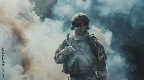 © Adi, Fototapeta premium Special operations forces soldier, army ranger or commando in camo uniform, helmet and ballistic glasses walking at battlefield