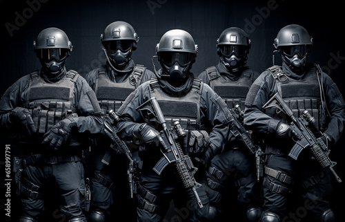 © annebel146, Naklejka premium Special police unit SWAT team officer standing in a row. Masked Team of Armed SWAT Police Officers with Rifles are Posing After a Successful Office Building Siege. Soldiers Stand in a Row and Raise