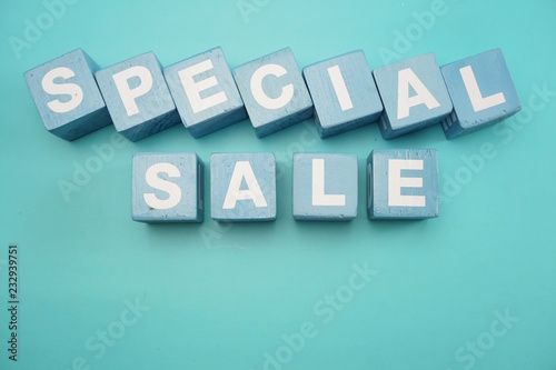 Obraz premium Special Sale word created with cubes alphabet letters on blue background