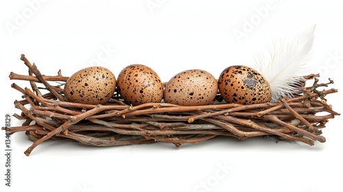 © Chang_Chanvit, Fototapeta premium Speckled Brown Bird Eggs in Rustic Twig Nest with Feather