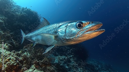 Fototapeta premium Speckled Deep-Sea Fish Near Coral Reef in Dark Blue Ocean