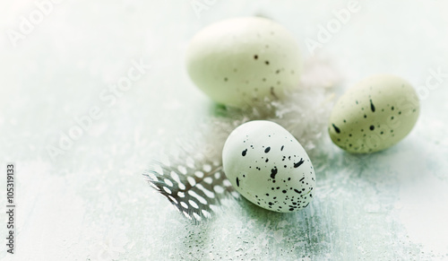© B.G. Photography, Obraz premium Speckled Easter eggs and feathers on a wooden surface