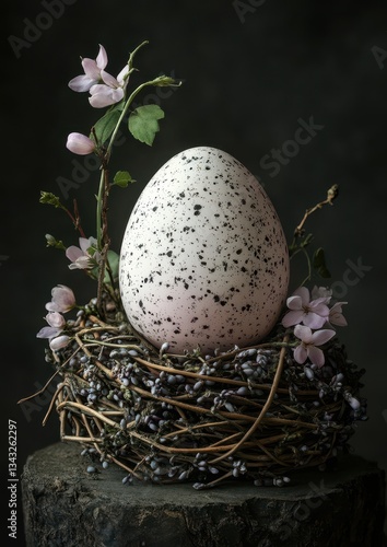 © Picstings, Obraz premium Speckled egg nestled in a decorative twig nest with flowers.