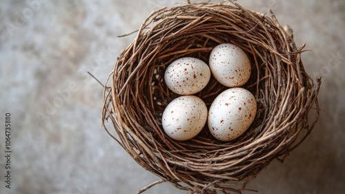 Fototapeta premium Speckled eggs in a nest on a natural background.