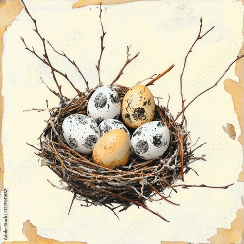 © SERHII, Obraz premium Speckled eggs in bird nest with twigs on vintage background