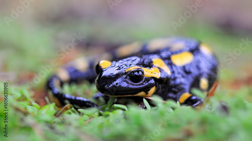 Obraz premium Speckled salamander in a garden after rain. Salamandra salamandra, Touraine,...